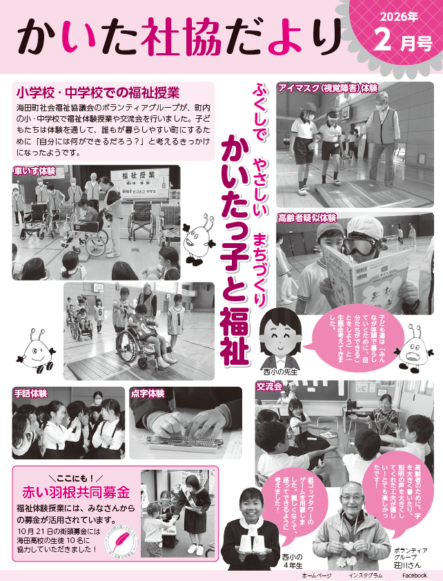 2026年1月30日 / 最終更新日 : 2026年1月30日 kaita1 未分類 『かいた社協だより2月号』を発行しました 社協だより2月号を発行しました! 今回のテーマは『かいたっ子と福祉』です。町内の小· 中学校で福祉体験授業や交流会を行った様子を紹介しています。 社協だよりは社協が実施するイベント情報や、相談窓口の情報、地域福祉やボランティア情報などを掲載しています。 町の広報紙とともに各ご家庭に配布されますので、ぜひご覧ください。